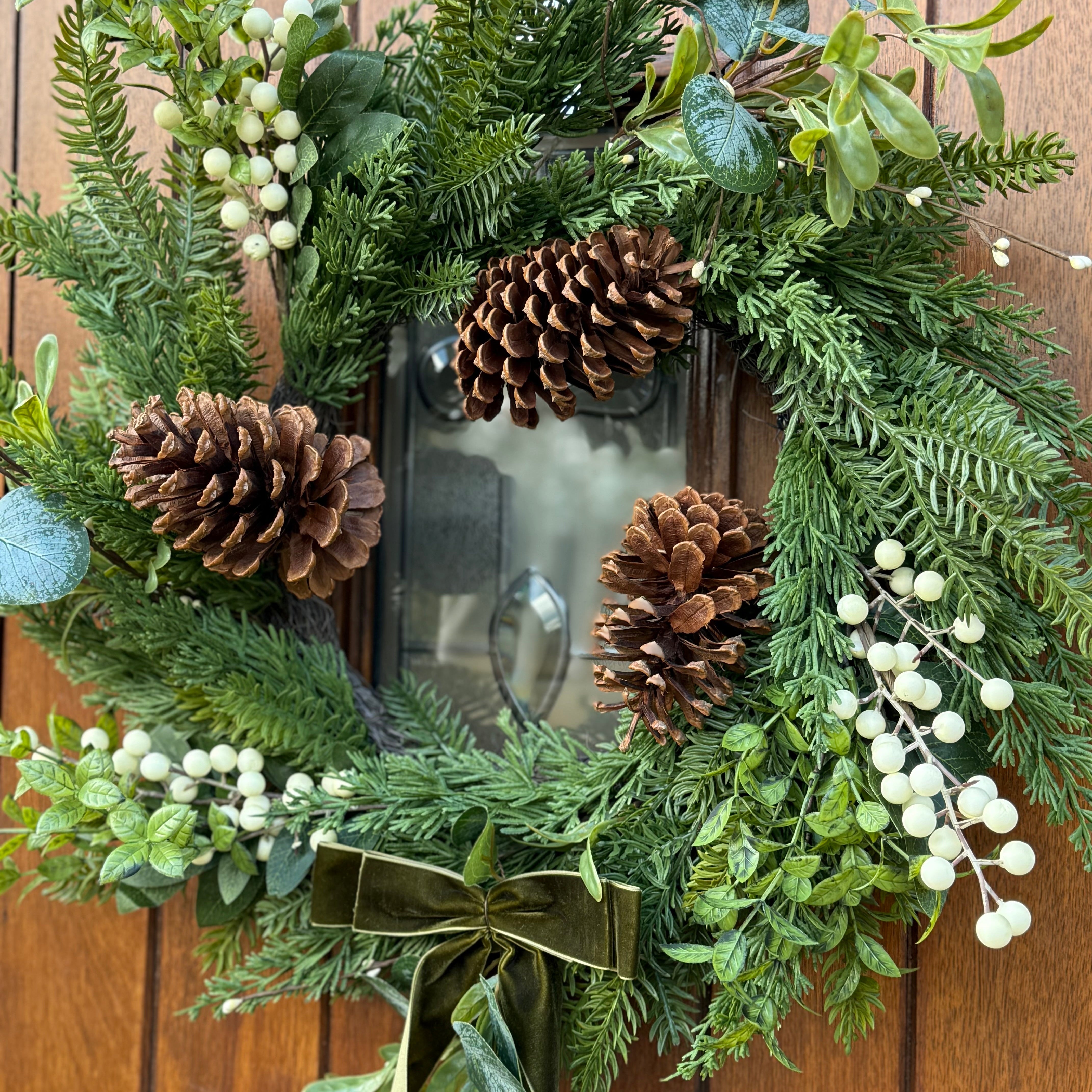 Christmas Faux Wreath - Pine Cone & Berry with Velvet Bow