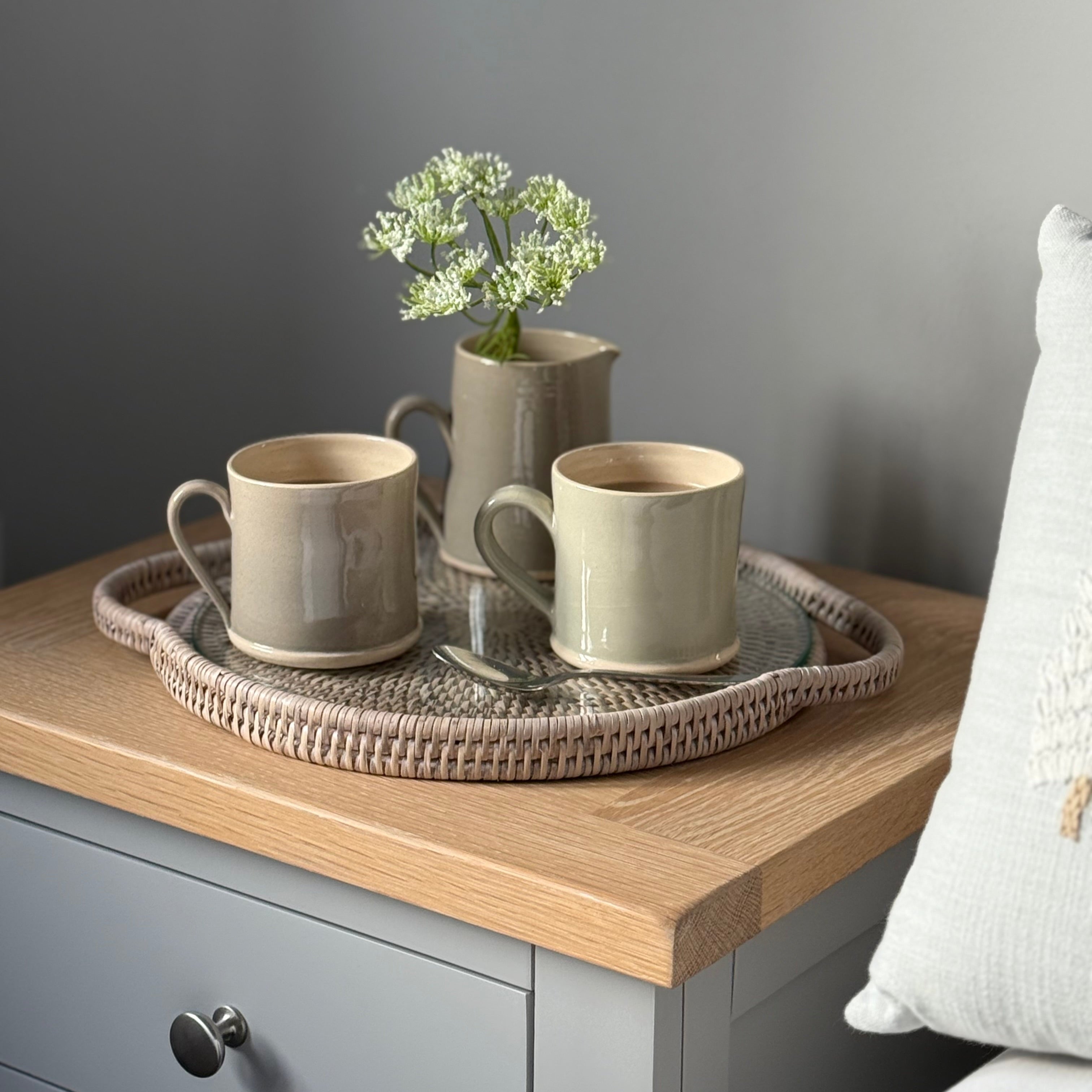 Introducing the Round Rattan Tray with Glass, a stylish and versatile addition to your home. Made from natural rattan, this round tray is perfect for serving drinks, snacks, or displaying décor items. The included glass adds a touch of elegance and makes cleaning a breeze. A must-have for any entertainer or home decorator.