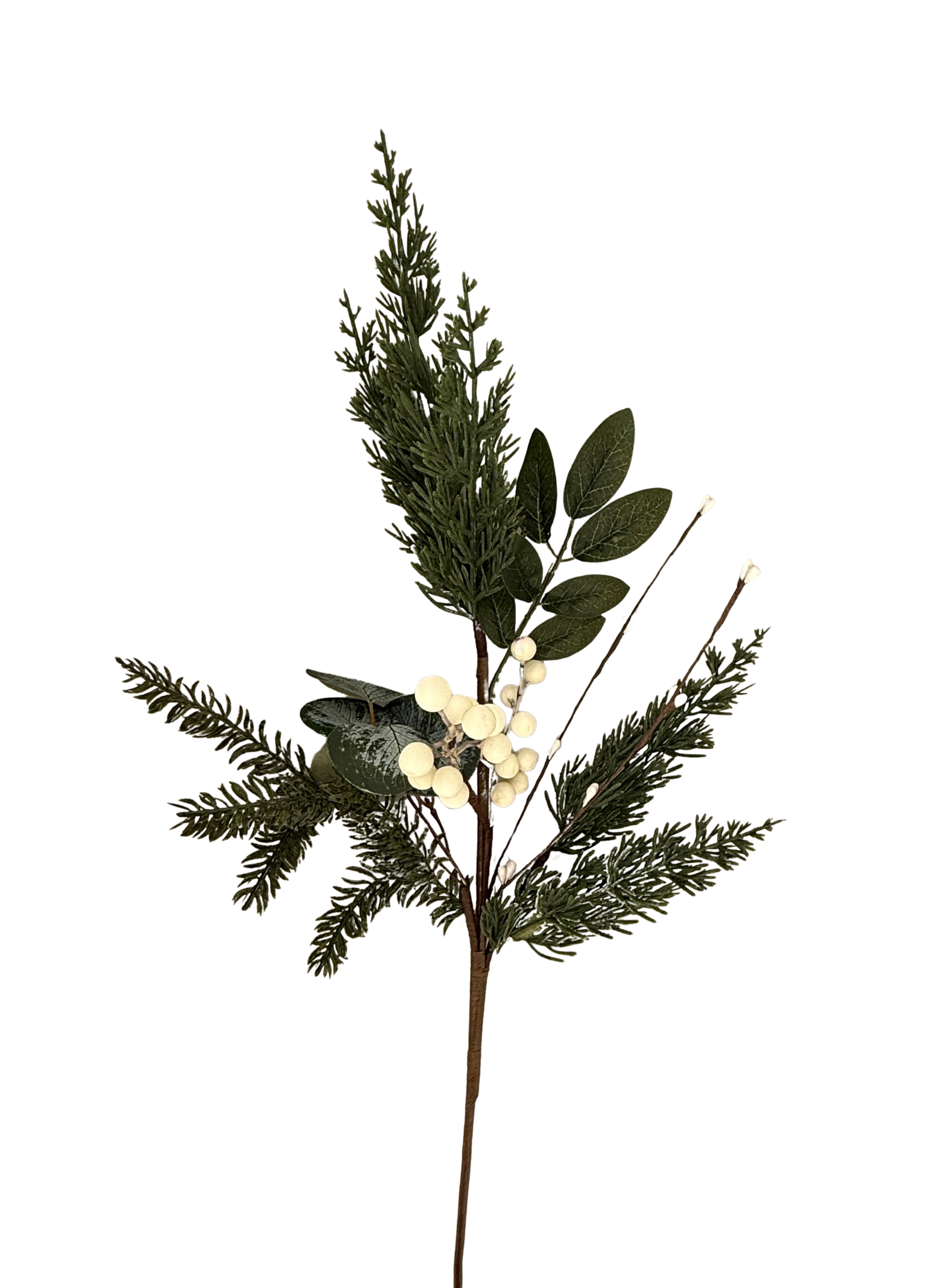 The Faux Winter Fir & Berry Branch features lush green needles complemented by a delicate array of vibrant berries, adding depth and texture. This artificial branch is beautiful as a standalone piece or combined with faux floral arrangements for enhanced visual interest.